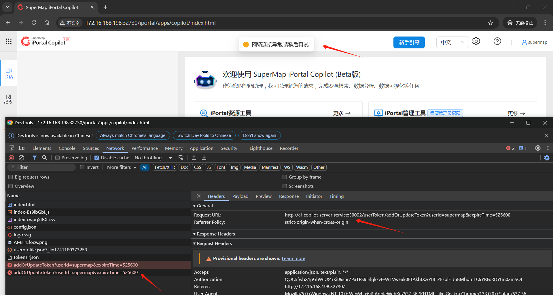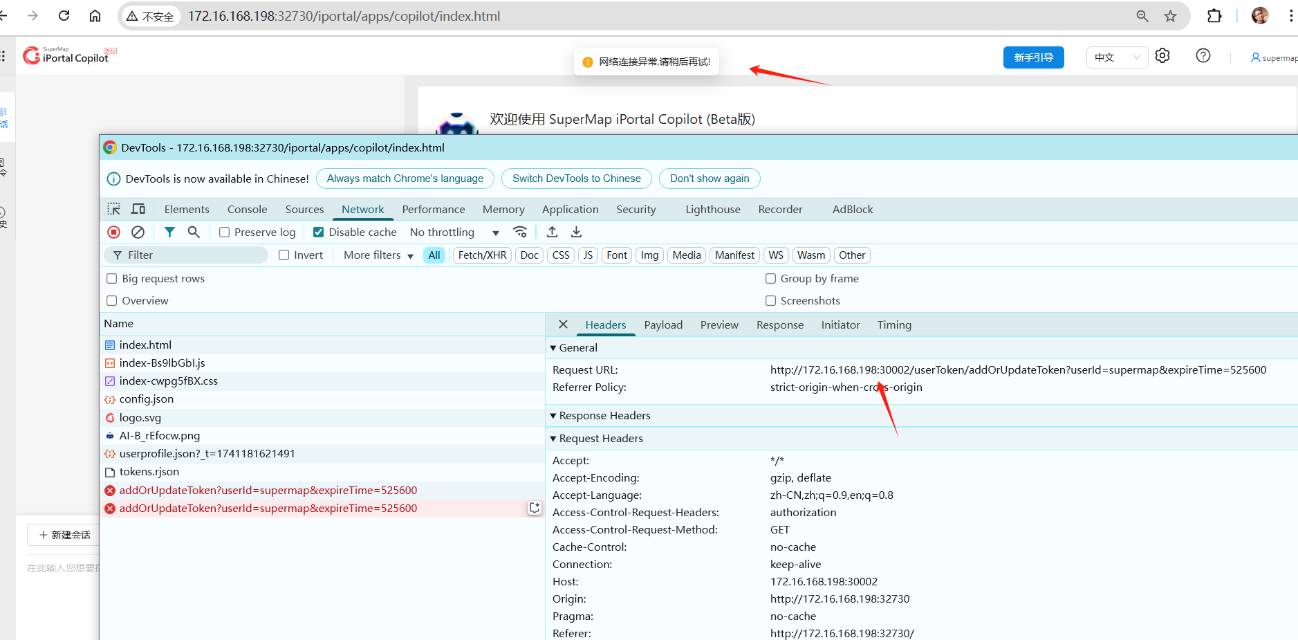 问题2:访问SuperMap iPortal AI助理首页,提示网络连接异常