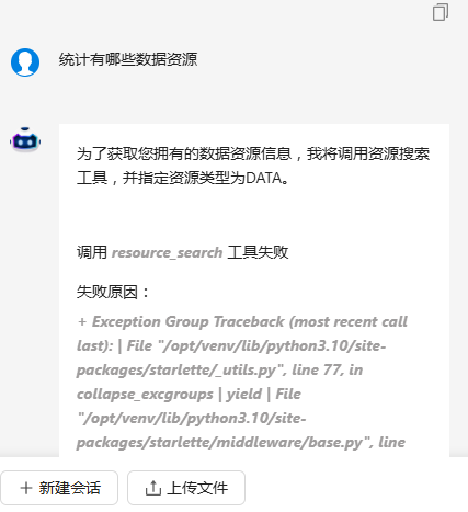 | 操作步骤 | 输入资源统计指令并发生,提示“调用resource_search工具失败” |