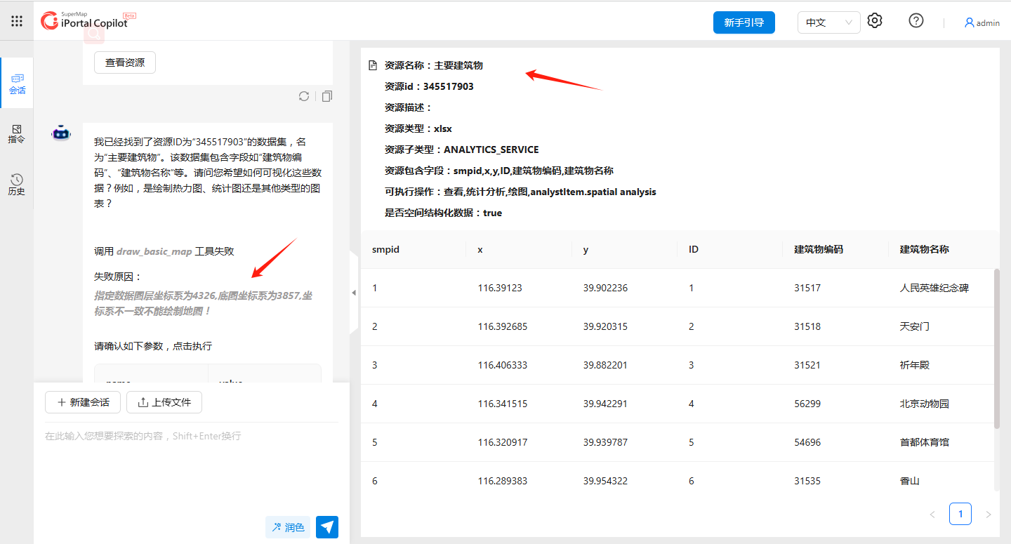 问题6:SuperMap iPortal AI助理 数资源可视化显示失败,提示坐标系不一致