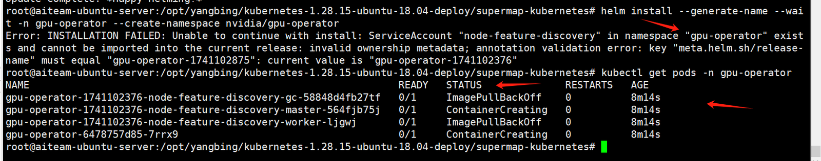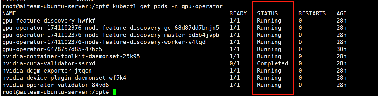 | 操作步骤 | SuperMap iPortal AI助理微服务部署时,执行命令安装gpu-operator后,查看对应的镜像服务不是running状态。 |