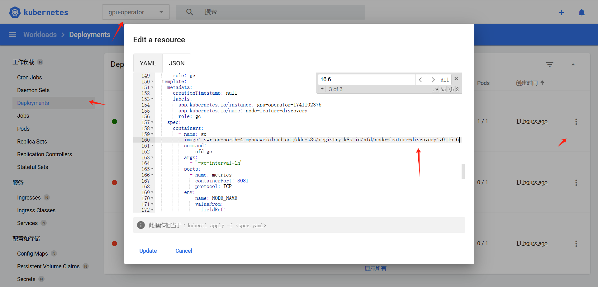 | 问题原因 | 通过k8s页面查看对应Pod的日志,提示镜像无法拉取,不存在 |