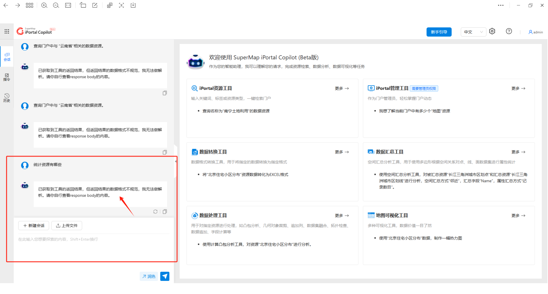 问题9:SuperMap iPortal AI助理发出指令后,提示数据不规范,无法解析