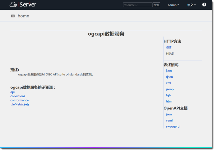 OGC API 数据服务提供了服务的 OpenAPI 描述,您可以快速了解该 API 的工作原理、配置信息,生成访问 Web 服务的代码。