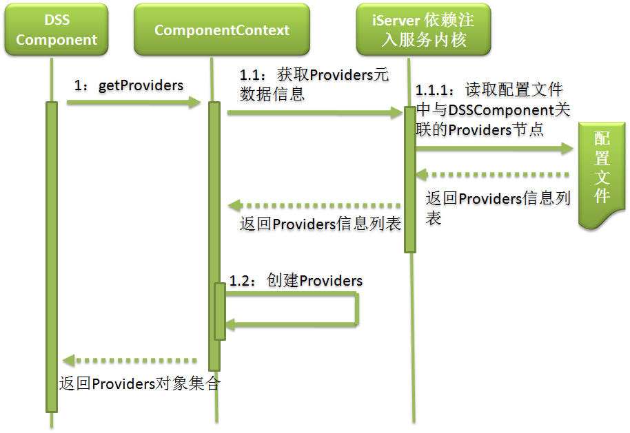 XXXContextAware 是 SuperMap iServer 为各个层次的服务模块提供的上下文依赖接口。通过实现该接口的 setXXXContext(XXXContext context)方法,SuperMap iServer 会通过依赖注入技术将服务配置文件中与 DSS 关联的上下文信息(XXXContext 对象)赋予 DSS。DSS 在获取了 XXXContext 后,就可以直接调用关联的模块对象。如下图,在 Component 层构建的 DSSComponent 通过实现 ComponentContextAware 的 setComponentContext(ComponentContext context)方法后,通过 ComponentContext 获取到所需的 Provider 对象,对该对象的 GIS 功能进行重组。