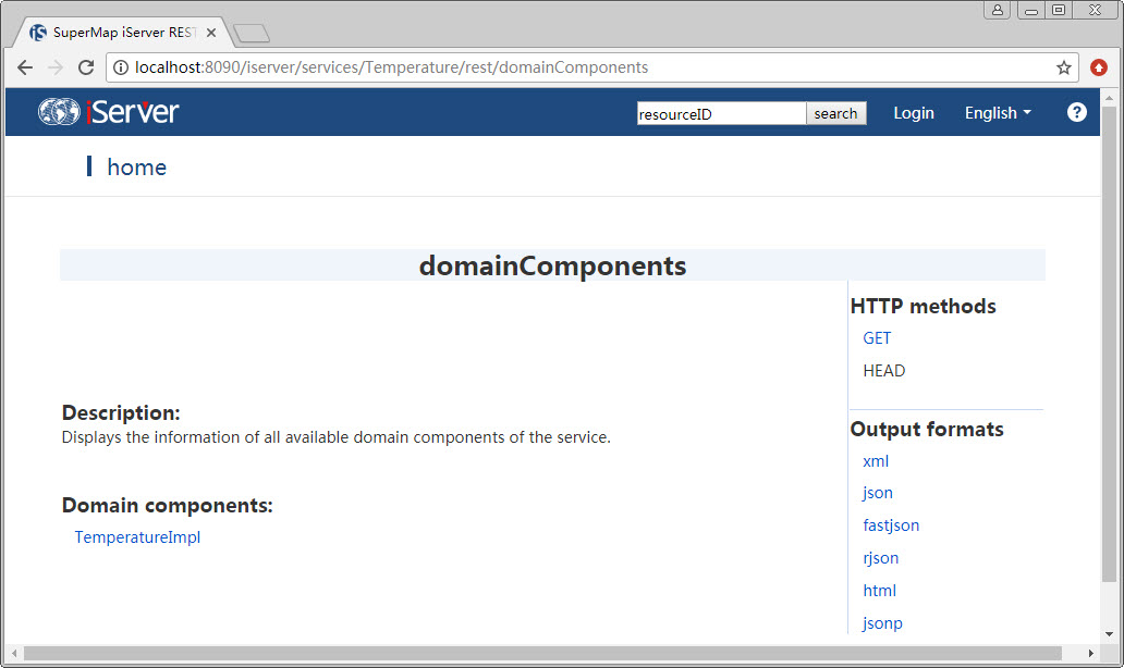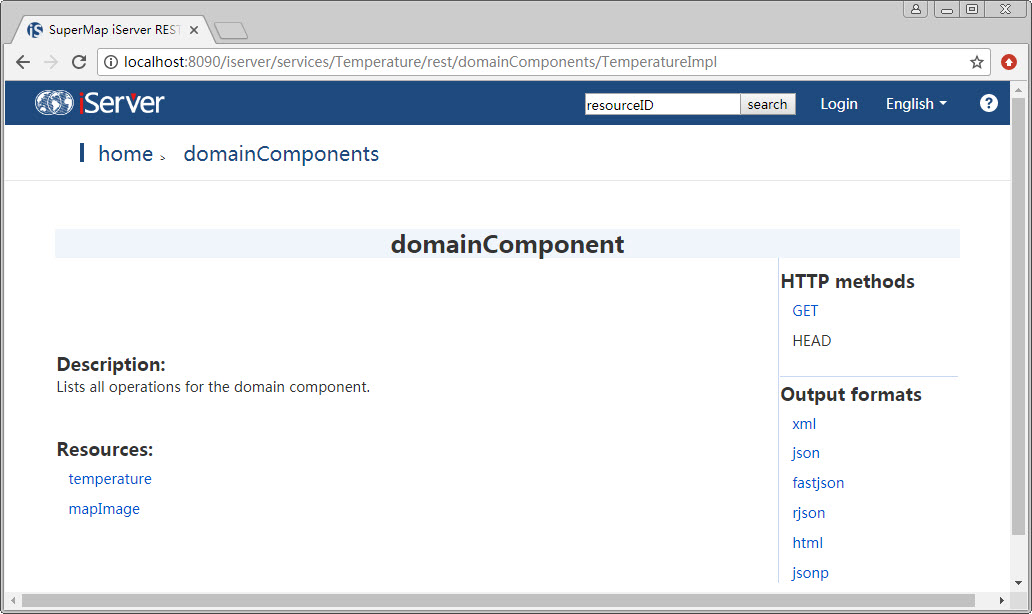 Click on the service link, and enter domainComponents, we can see the Temperature component has been published as a resource, and its methods have been published as resources too.