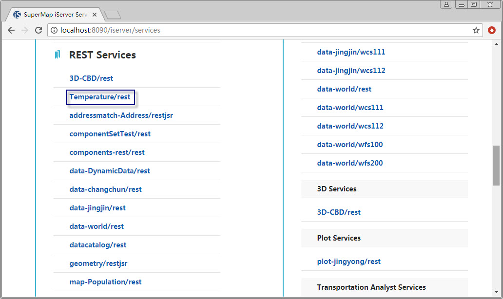 Start SuperMap iServer service, the link of the newly added Temperature service will be shown on the services page (http://localhost:8090/iserver/services).