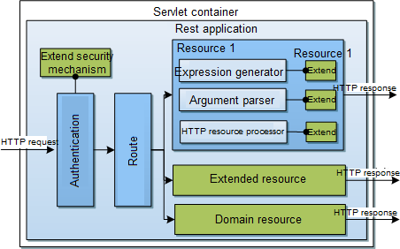 Below shows how an HTTP request sent by a client to access SuperMap iServer REST service is processed on SuperMap iServer. In green is places where the extension can be performed.