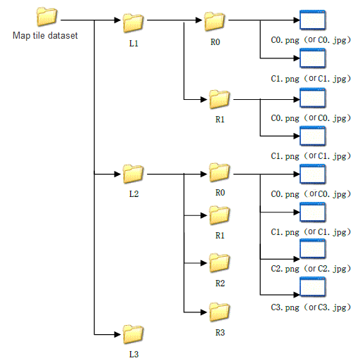 The tile format class primarily defines specific tile storage and organization method, including scale, tile split and catalog organization, naming, etc. In the Geographic Information Public Service Platform -- Electronic Map Data Specification, tile structure is defined as follows: