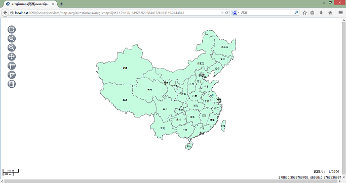 Access the map REST functions via URI:http://<host>:<port>/iserver/services/map-arcgis/rest. Access the map via http://<host>:<port>/iserver/services/map-arcgis/rest/maps/arcgismaps.ijs. Arcgismaps is the map name that is declared in ArcGISExplodedCacheMapProvider. The result is as follows: