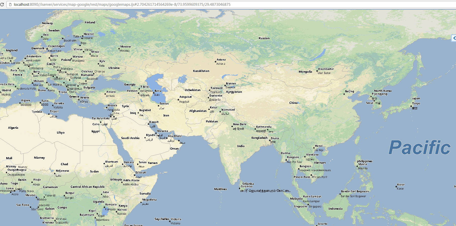 Access the map REST service with the root URI: http://<host>:<port>/iserver/services/map-google/rest. And access the map with the name googlemaps, which is declared in the implementation class of GoogleMapsMapProvider, through http://<host>:<port>/iserver/services/map-google/rest/maps/googlemaps.ijs. with the result shown as below: