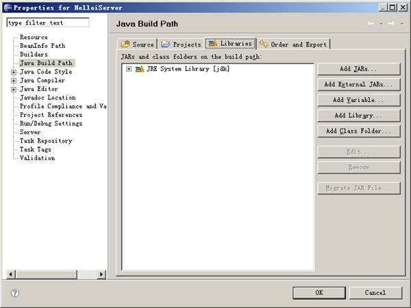 Select Java Build Path on the left side of the pop-up Properties for HelloiServer widow, then select the Libraries tab and click the Add External JARs button.