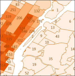 Aggregate Points refers to creating an aggregation map based on a point dataset. First, it separates the points on the map with grids or regions. Secondly, it calculates the number of the points in each region or grid and take it as the statistical value of the region or grid. It can also use weighted field of points as the statistical value of the region or grid. At last, it fills the regions or grids with graduated color.