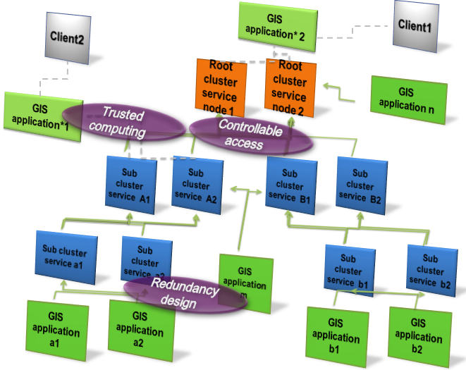 A distributed hierarchical cluster is composed of multiple root cluster service nodes, multiple child cluster service nodes, and multiple GIS application nodes. There is redundancy design of GIS application nodes and cluster service nodes on each level, in order to ensure the fault-tolerance capacity of the entire cluster system.