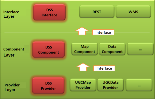 Servlet or Interface in the Interface level: built by different service mode, Servlet or Interface, publish Component module as various kinds of service, e.g.: Map Component as REST style map service, Data Component as WFS service.