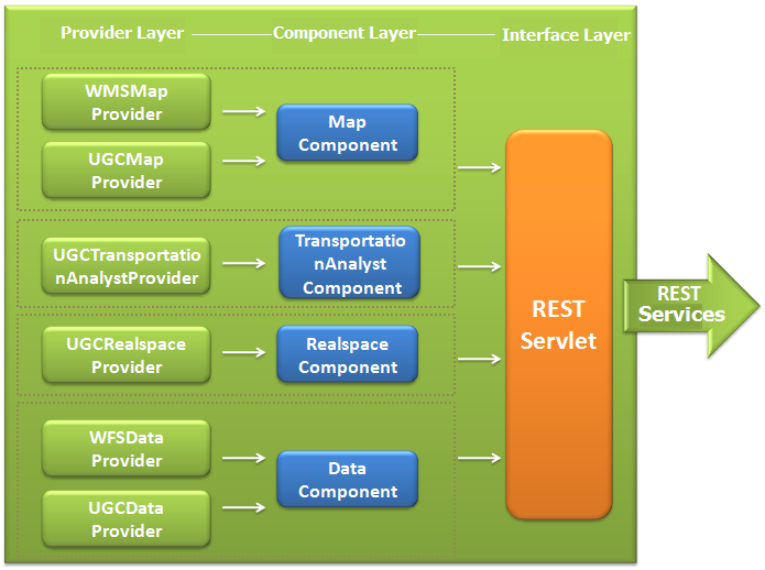 SuperMap iServer provide the GIS services with multi-layer architecture, as shown below, including provider, Component and Interface. Where Interface provides the interface REST Servlet to implement GIS functions and REST publishing. In Provider and Component, they both provide the service modules corresponding different service contents. Configure the REST Servlet interface. SuperMap iServer can build the REST services with different contects. As shown below, Provider module and Component module publish the map REST service through the REST Servlet interface. Map REST service={WMSMapProvider,UGCMapProvider}+MapComponent+REST Servlet; Data REST service={WFSDataProvider,UGCDataProvider}+ DataComponent+REST Servlet and so on.