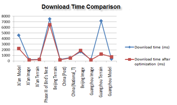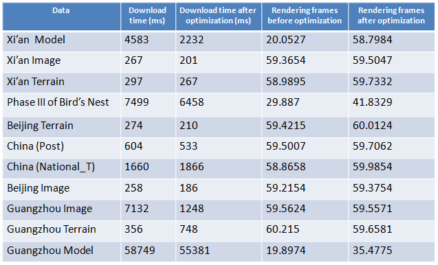 Comparison of the download time and rendered frame number before and after the SuperMap 3D client optimizing the downloaded image data, model data, terrain data and vector data.