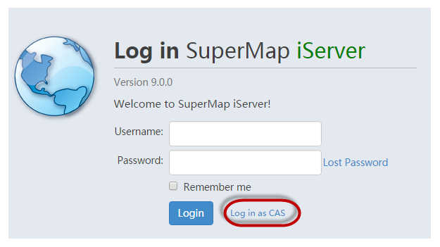 After single sign-on is enabled, CAS user accounts can be used to access protected services or to log in Service Manager. If Built-in Account Login option is checked when configuring the SSO, the login interface is shown as below. Users can choose to use the existing user to log in, or click on the Log in as CAS to jump to the CAS user's login interface, then CAS users can log in. After successful authentication by the CAS server, users can access iServer services and CAS server associated GIS services of iServer and iEdge and iPortal.