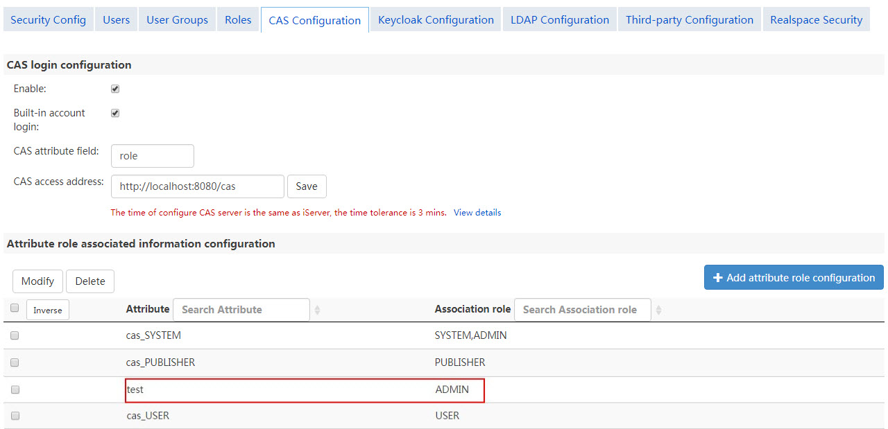 The relationship between CAS attribute values and iServer/iPortal/iEdge existing roles is many to many. iServer built-in roles USER, PUBLISHER and ADMIN match the three CAS user attributes as cas_USER, cas_Publisher, cas_ADMIN respectively. If there are no these three attribute values in the specified association fields of CAS server, the association does not take effect.