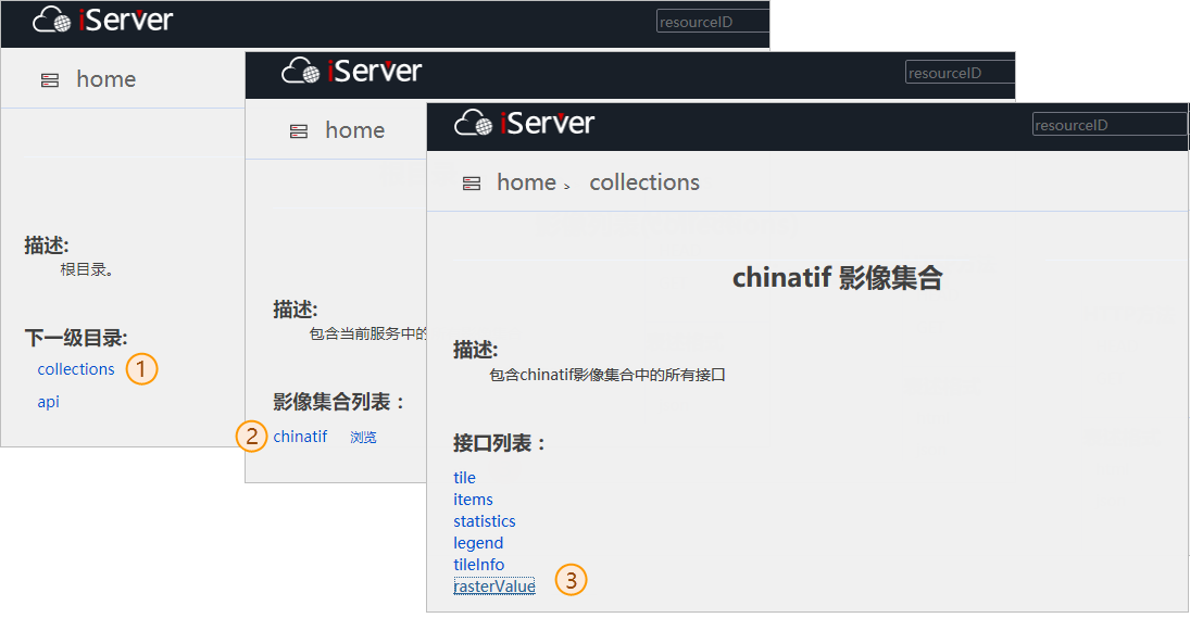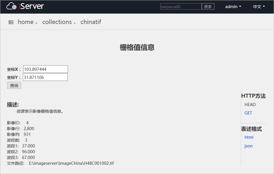 2. On the root directory page of image service, click "collections" to enter the image collection list page; click a collection, such as "chinatif", and click "rasterValue" to enter the rasterValue request page.