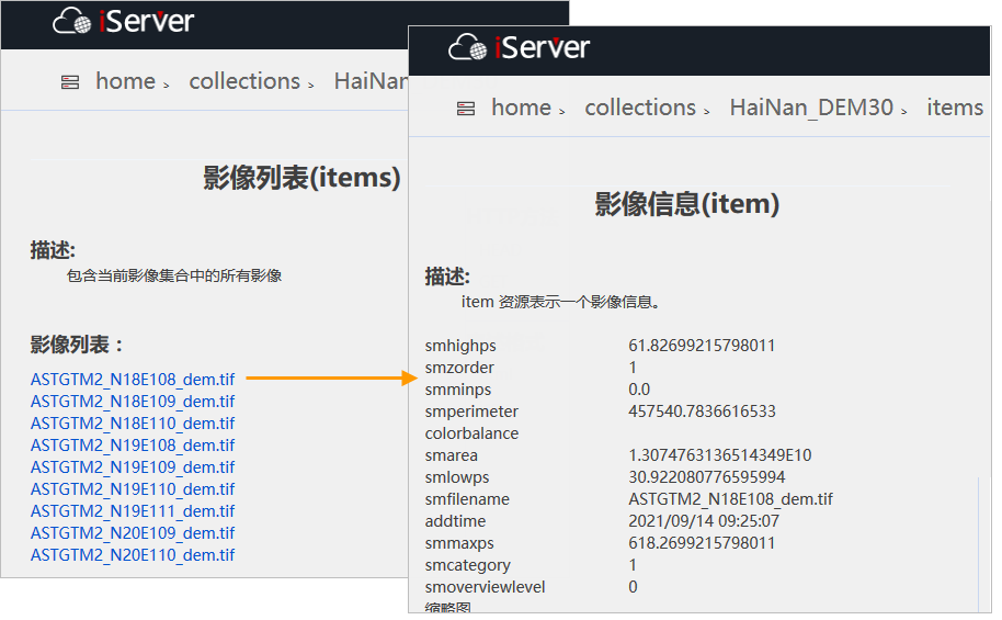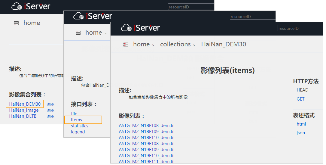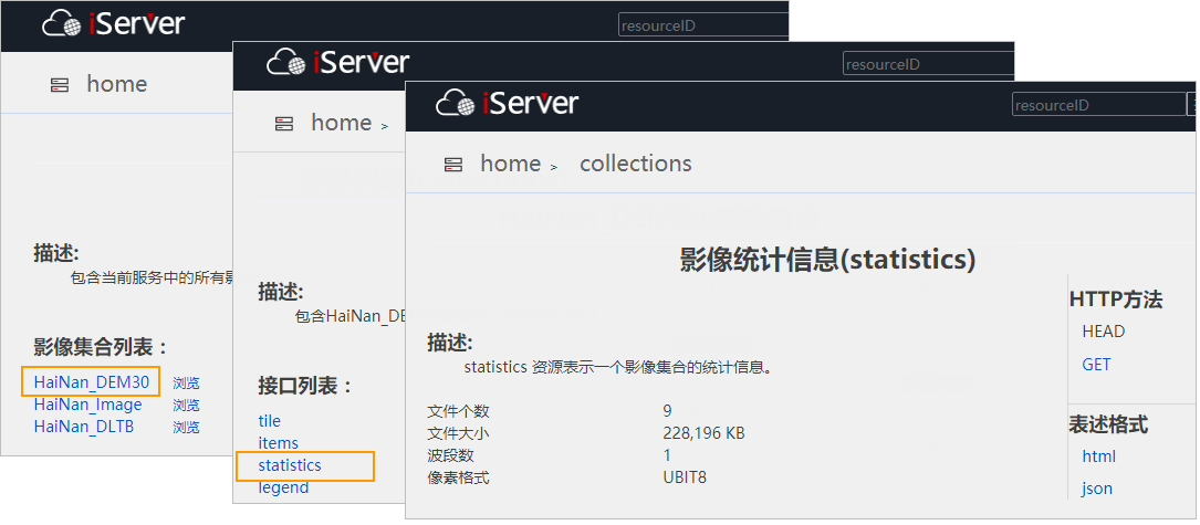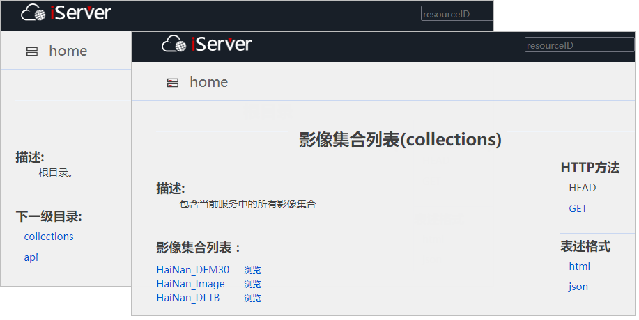 Access the REST image service, such as http://localhost:8090/iserver/services/imageservice-HaiNan/restjsr, enter the root directory of the image service, and click "collections". Enter the image collection list, where all collections in the current service are listed.