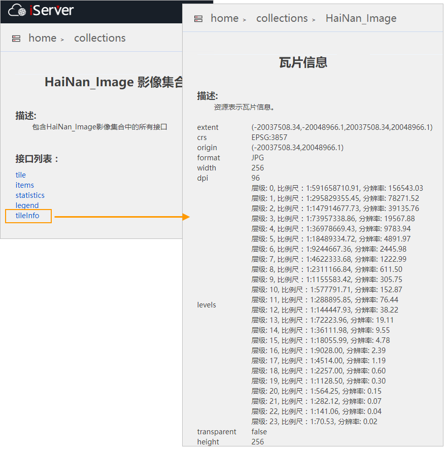3.Enter the "tileinfo" description page of the collection, as shown in the following figure: