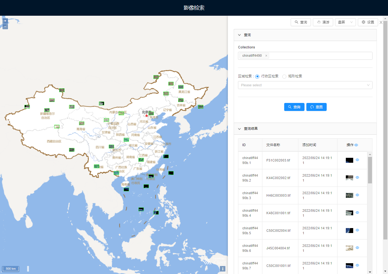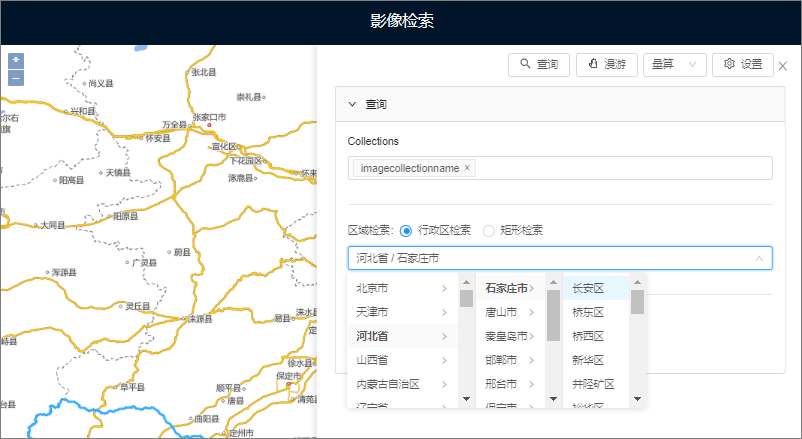 Note: Administrative area and rectangle retrieval are based on geographic range. If both are set at the same time, the rectangle range will be used as the retrieval range. Image collection and geographic range conditions are valid at the same time.