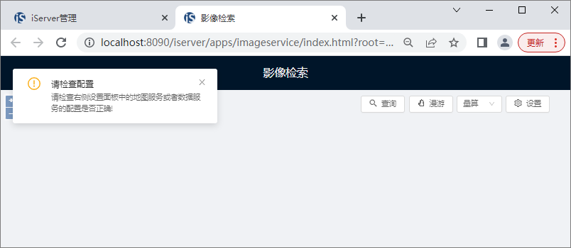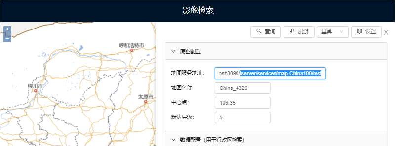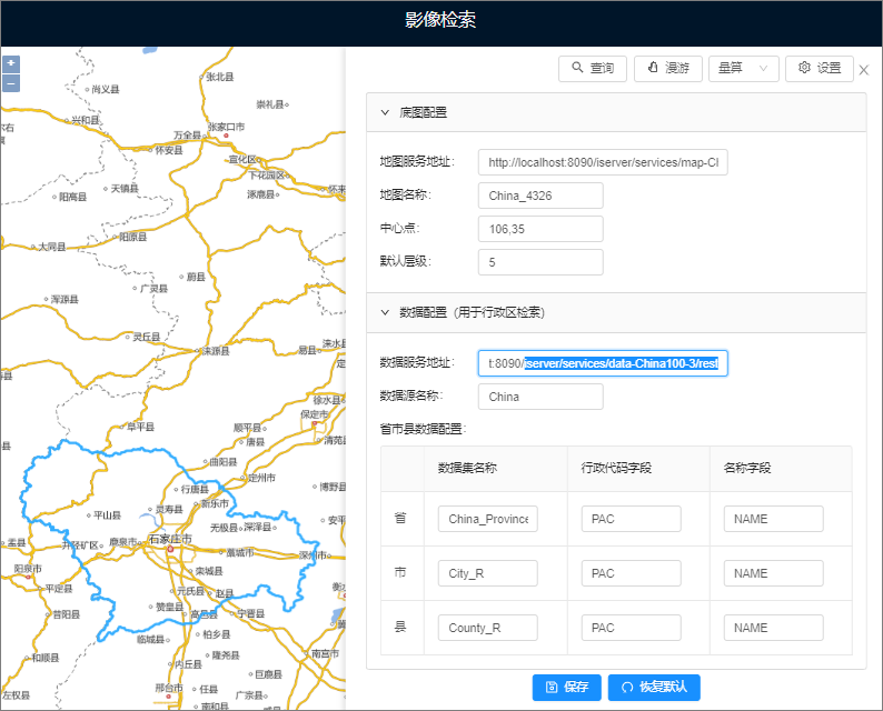 The image retrieval page will load the "data-china" data service in the iServer demonstration service by default. If the loading fails, the page will prompt. At this time, it can be configured as required. The specific operations are as follows: