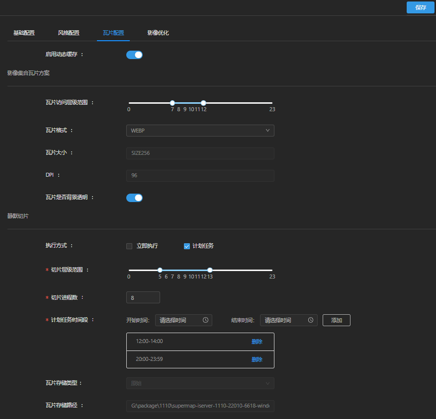 Configure the image type of the slice and other parameters, and continue to set the following parameters on the "Tile Cache Config" page: