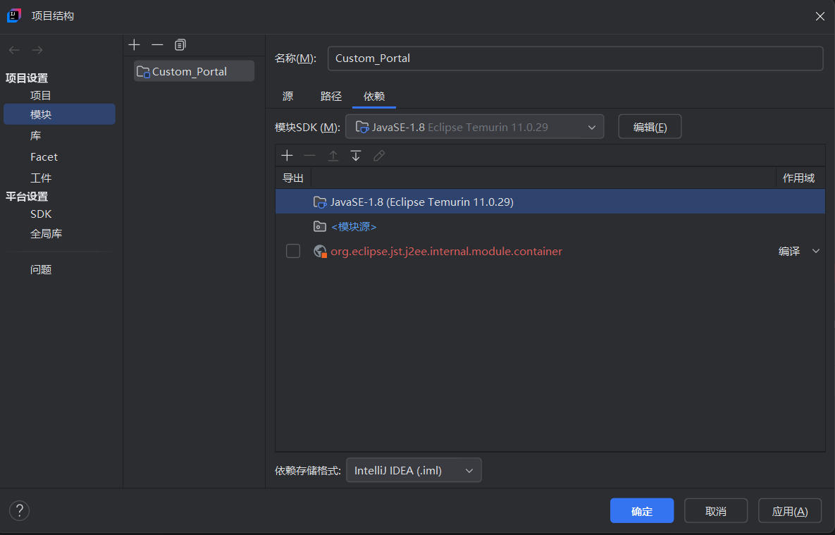 第五步:在 Eclipse 中,右键点击 Custom_Portal 工程,选择 Build Path > Configure Build Path,在弹出的对话框中点击 Libraries 选项卡,拖动下方滚动条选中 JRE System Library,然后点击右侧的 Edit 按钮,选择自己本机配置的 JDK 11 版本,如下图所示: