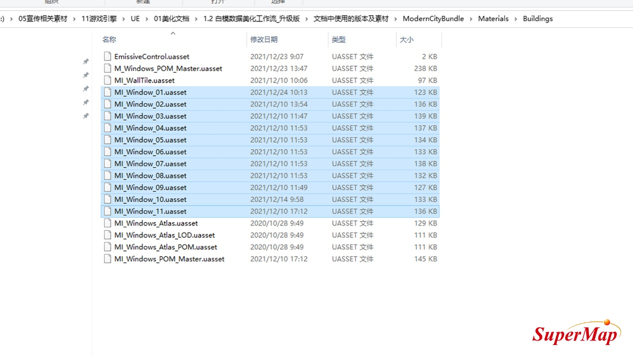 "Materials"中,默认给出了材质的关联关系,其中"AssociateMaterial"后面的材质名称为UE中的材质;"OriginalMaterial"后面的材质名称为S3M缓存数据的材质名称,是在数据处理第三步中,设置的顶面材质与侧面材质的属性值。