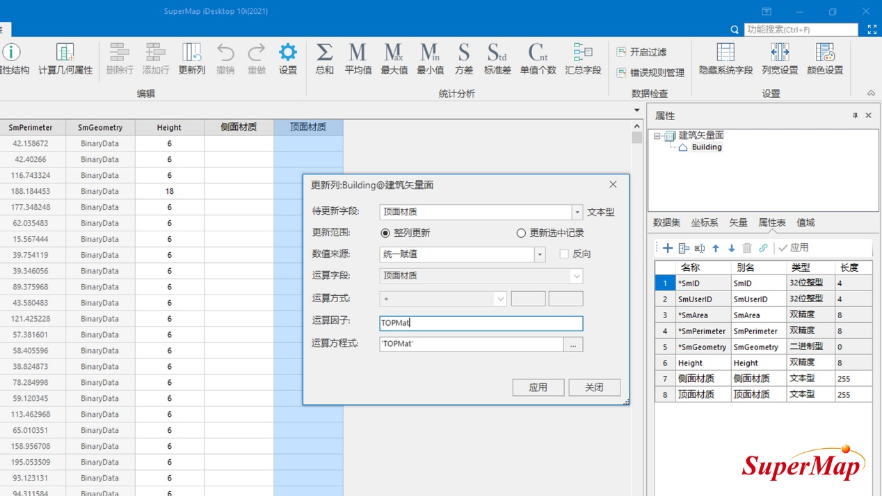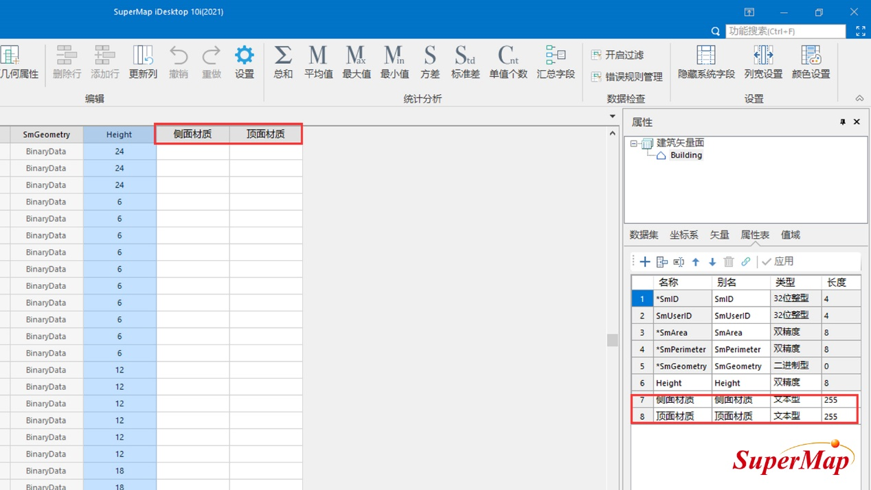 打开面数据集的属性面板,在其属性中,添加“侧面材质”,“顶面材质”两个文本型属性;