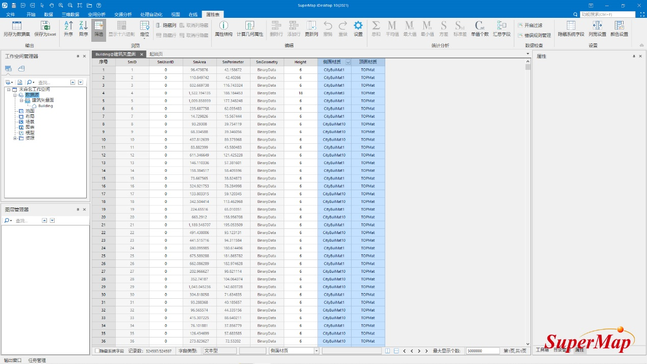 原始数据是建筑矢量面数据,属性表中需要有建筑高度或楼层数相关的属性,便于后期根据此属性拉伸成模型,示例中使用Height中的属性值。