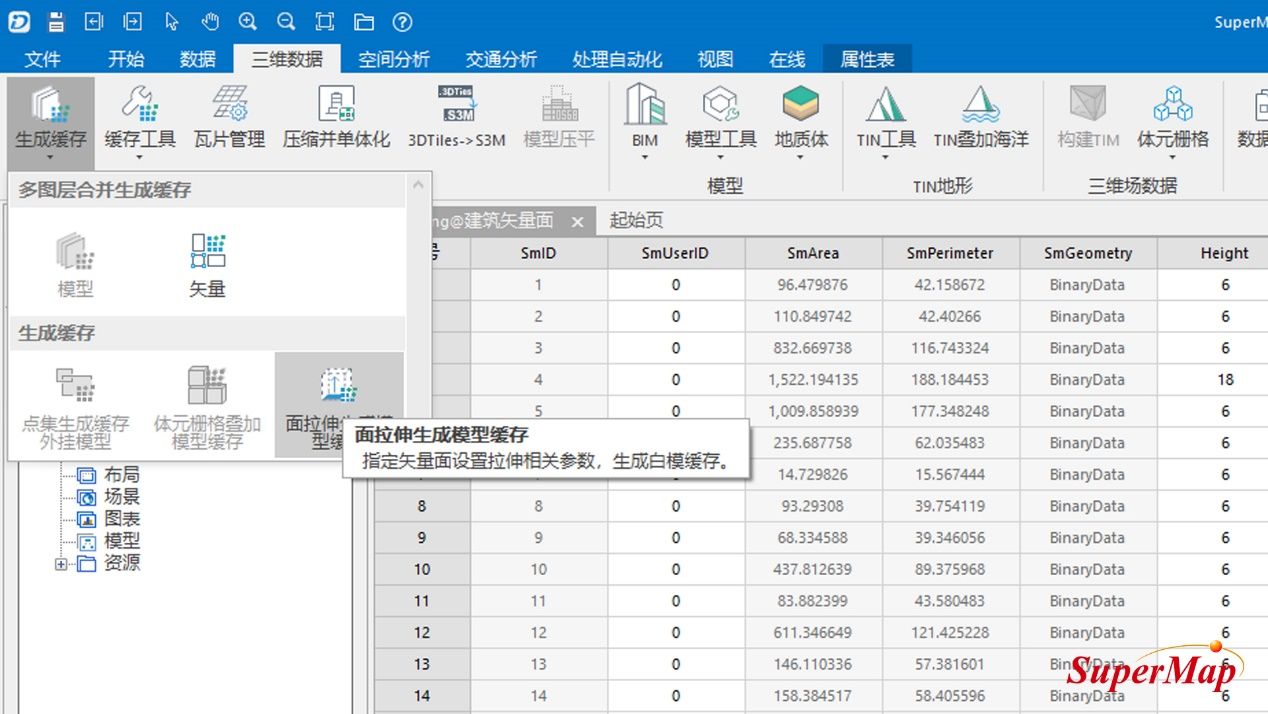 选择“三维数据-生成缓存-面拉伸生成模型缓存” 功能,在弹出的面板中,选择建筑矢量面数据集。