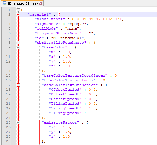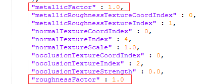 如果想要调整材质的明暗程度,可以修改metallicFactor和roughnessFactor参数的值,当粗糙度roughnessFactor的值等于0的时候,会没有PBR的效果,所以需要设置大于0。此外还可以在此处添加 "intensityScale"参数来调整。