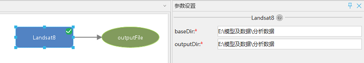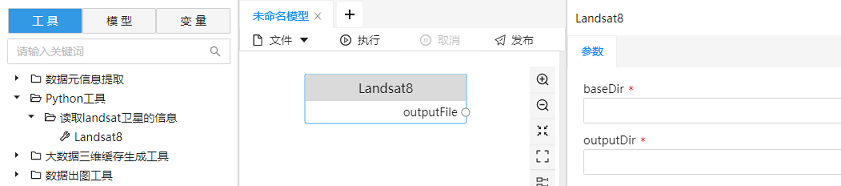 添加完成后即可在 Python 工具分组下查看新增工具,将工具拖拽到画布上填写参数。baseDir 参数中填写影像文件的根目录,以遍历该目录下所有名字中包含*_MTL的txt文件,outputDir 参数中填写.csv文件的输出路径。