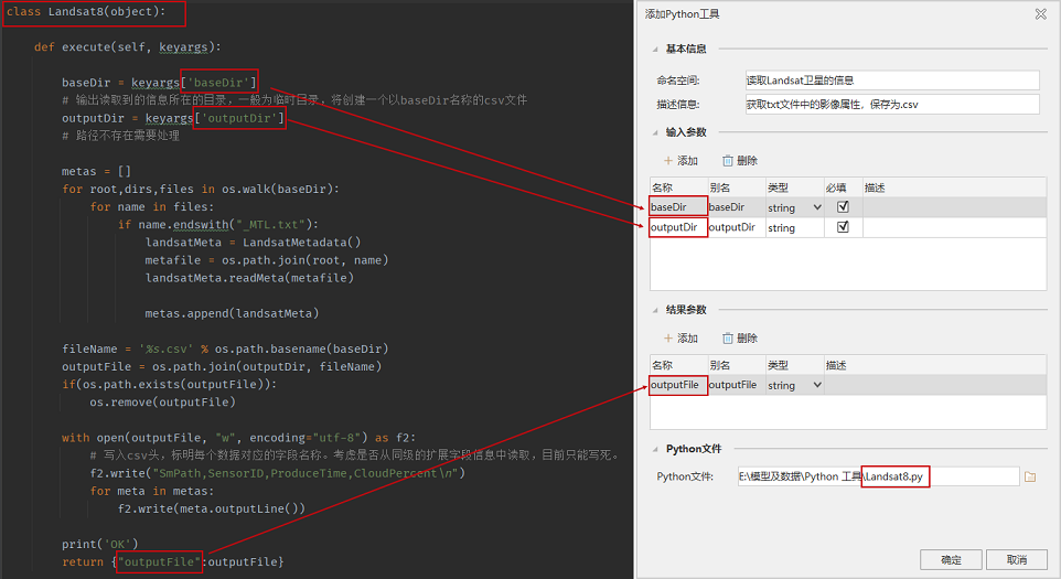 首先,在弹出的对话框中,定义工具的输入参数和结果参数,这里需要注意的是传入的参数要与 execute 方法参数中取出的参数名相同。接着,选择本地已有的 Landsat8.py 文件。最后,点击确定就完成了 Python 工具的添加。