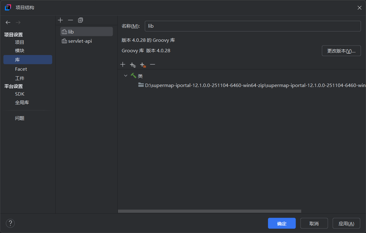 第四步:点击文件->项目结构->项目设置->库,点击+,选择新建JAVA项目库,分别导入%SuperMap iPortal_HOME%\webapps\iportal\WEB-INF\lib 及 %SuperMap iPortal_HOME%\lib\servlet-api.jar,并均将两个库添加至Custom_Portal模块中。