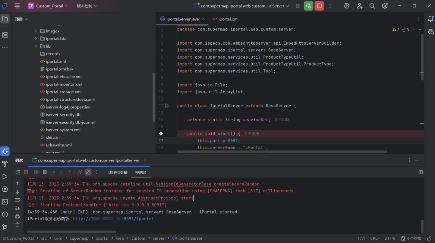 第七步:在IntelliJ IDEA中启动IportalServer.java,启动成功可以获取到SuperMap iPortal的地址。
