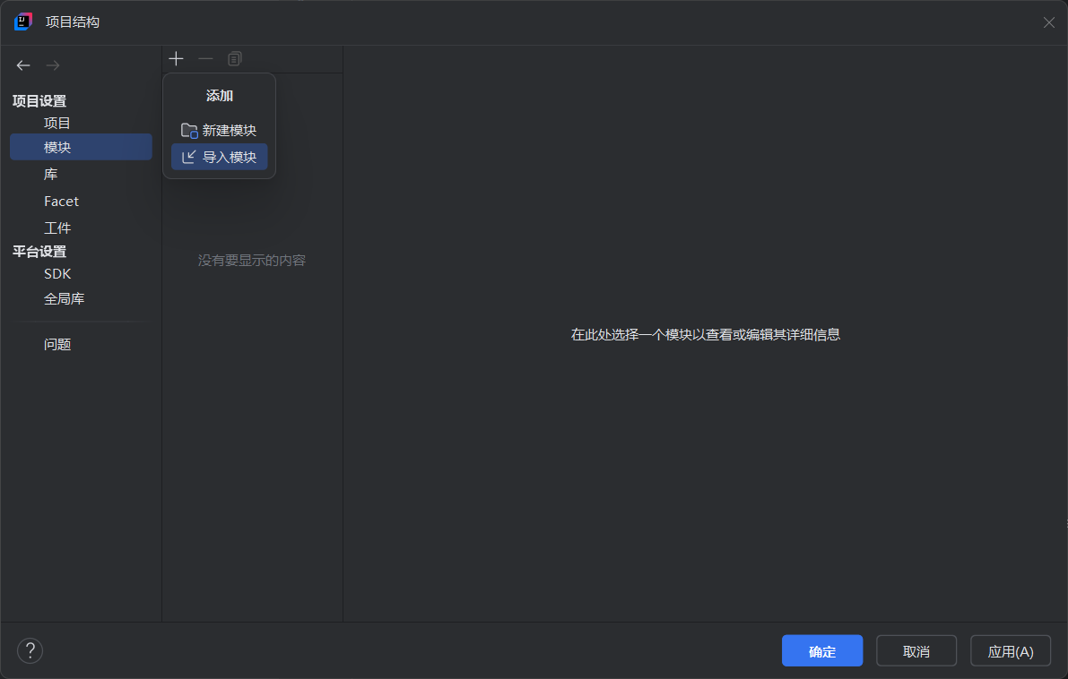 第三步:点击文件->项目结构->项目设置->模块,点击+,选择导入模块,选择%SuperMap iPortal_HOME%\samples\code\CustomPortal \Custom_Portal目录作为模块导入,接着选择从外部模型导入模块,并选择Eclipse,后续页面选项遵循默认即可。